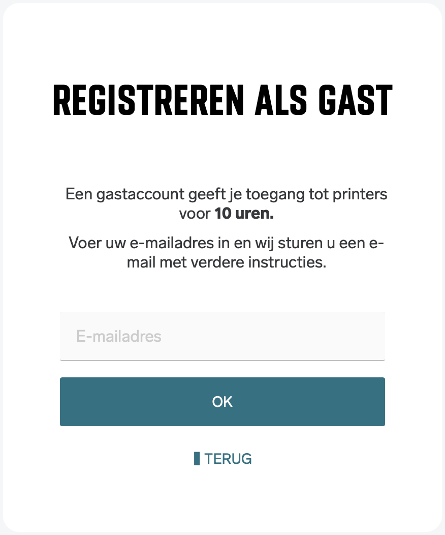 Ben je gast en heb je geen rijkspas? Dan kun je alsnog gebruikmaken van de printerfuncties printen en kopiëren. Hiervoor moet je eerst een gastaccount aanmaken.