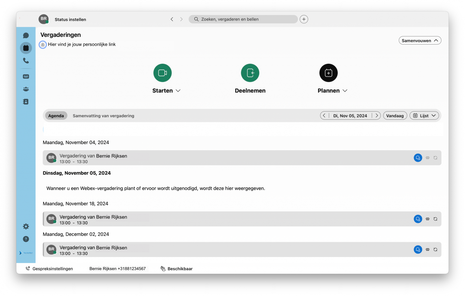 - Open de Webex-app en klik links in het menu op Vergaderingen.