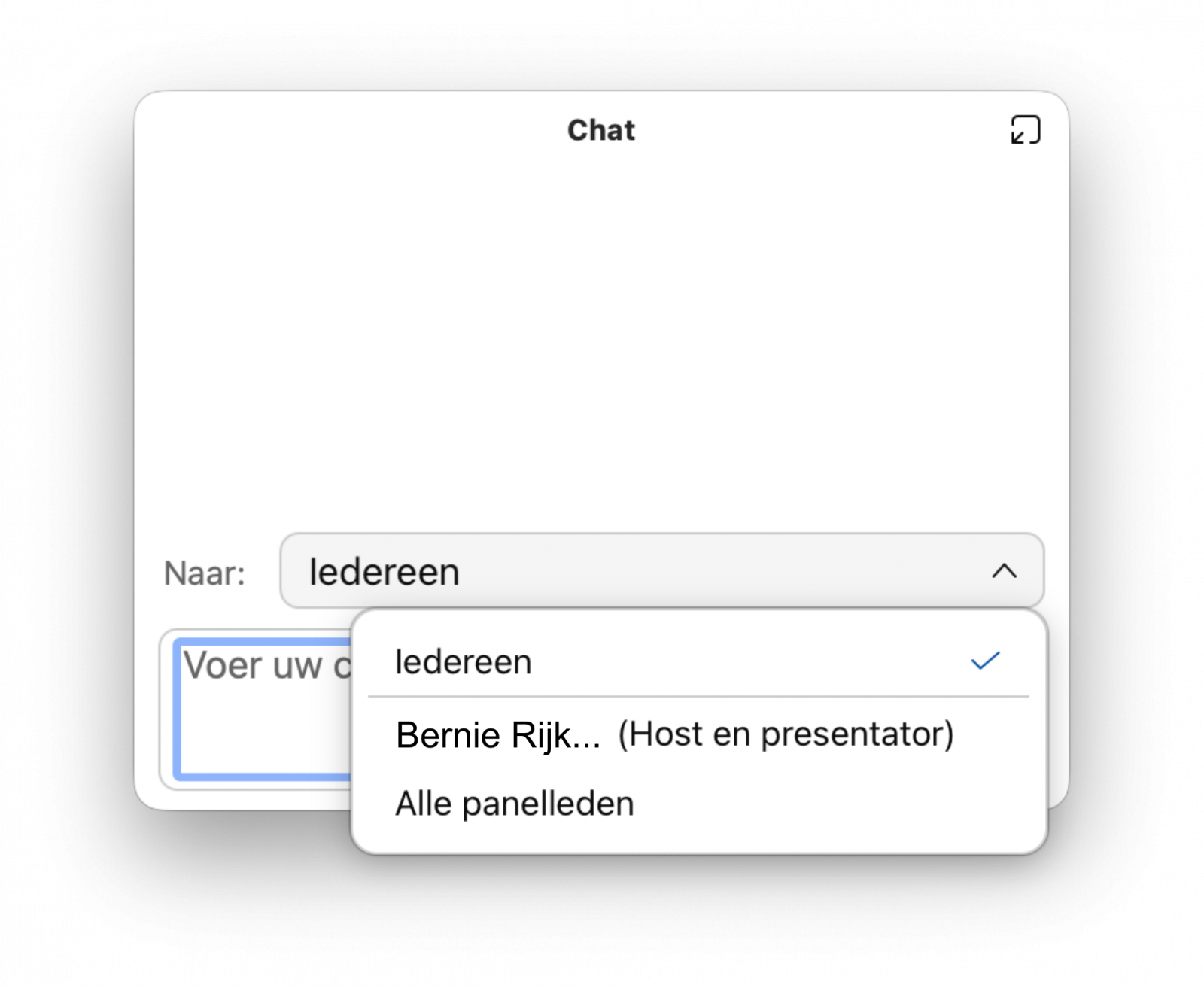 De chat vind je rechts onderin het Webinar-venster en open je door te klikken op Chat . Vervolgens heb je de volgende mogelijkheden: