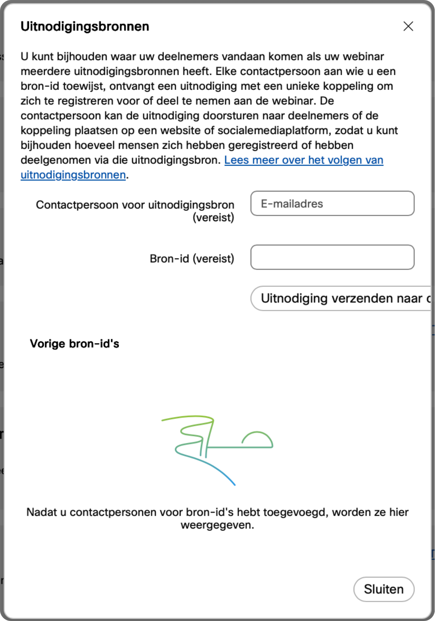 Vaak deel je je registratielink op verschillende plekken of met verschillende personen. Wil je weten waar de registraties vandaan komen en dus via welke route ze zich hebben geregistreerd? Dan kun je gebruik maken van de Uitnodigingsbronnen. Dit werkt op de volgende manier: